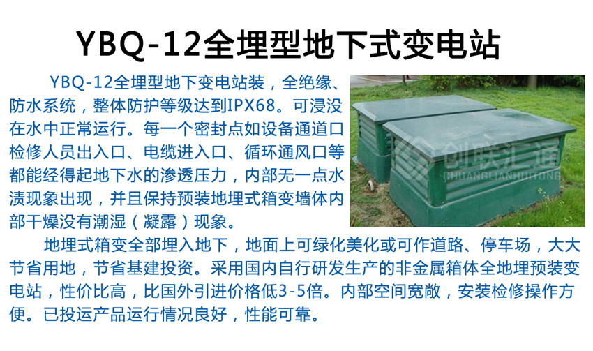 YBDM-12系列地埋箱式變電站(簡(jiǎn)稱(chēng)地埋式箱變),是在充分研究和探討現(xiàn)代城市建設(shè)和管理的基礎(chǔ)上,新開(kāi)發(fā)出的新一代箱式變。其主體部分或全部埋入地下,占地很少,甚至不占地,視覺(jué)效果非常好,有效解決了城市用地緊張和城市牛皮癬的矛盾,與周邊環(huán)境和諧統(tǒng)一,備受廣大專(zhuān)家和用戶(hù)的推崇。地埋箱式變電站是指該箱式變電站的成套裝置全部安裝于一個(gè)全密封的箱體內(nèi)部并把整體設(shè)制于地平面以下,它和地面上箱式變電站,內(nèi)部設(shè)備是相同的,同樣是由10KV輸入電壓經(jīng)變壓器降為400/220V配電電壓再送配至使用負(fù)荷點(diǎn),可用于環(huán)網(wǎng)配電系統(tǒng),也可作為放射式電網(wǎng)終端供電的變電站。這種全地埋型又稱(chēng)地下變電站,它的箱體具有極好的防腐能力和抗壓能力,并具有絕對(duì)的密封性。