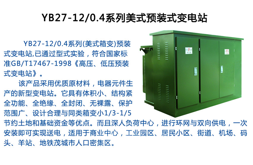 YB27-12/0.4預裝式變電站是產(chǎn)化美式箱變。該產(chǎn)品作為電纜化配電網(wǎng)中重要的供電單元,集高壓控制、保護、變電、以及配電設(shè)備于一體的成套預裝產(chǎn)品,廣泛應(yīng)用于城鄉(xiāng)配電網(wǎng)之中。