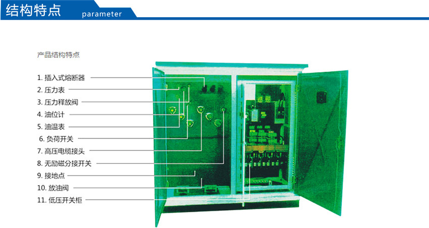 該產(chǎn)品將高壓負荷開關(guān)、高壓熔斷器置于變壓器油中,具有與變壓器器身共箱或分箱兩種結(jié)構(gòu)形式。油箱采用全密封結(jié)構(gòu),配有油溫表、油位表、壓力表、壓力釋放閥、放油閥等元件以監(jiān)測變壓器運行狀況。該產(chǎn)品分為環(huán)網(wǎng)型、終端型及電源型供電方式。為了使此種產(chǎn)品更適合于我電網(wǎng)的實際要求,公司又推了插拔型干式熔斷器,熔絲的熔斷不影響變壓器油的性能。根據(jù)低壓饋出要求的復雜程度,YBM-12/0.4型產(chǎn)品分為標準型、加強型和綜合型三種外殼形式,使用戶和設(shè)計單位在選型時,做到更靈活、更經(jīng)濟。