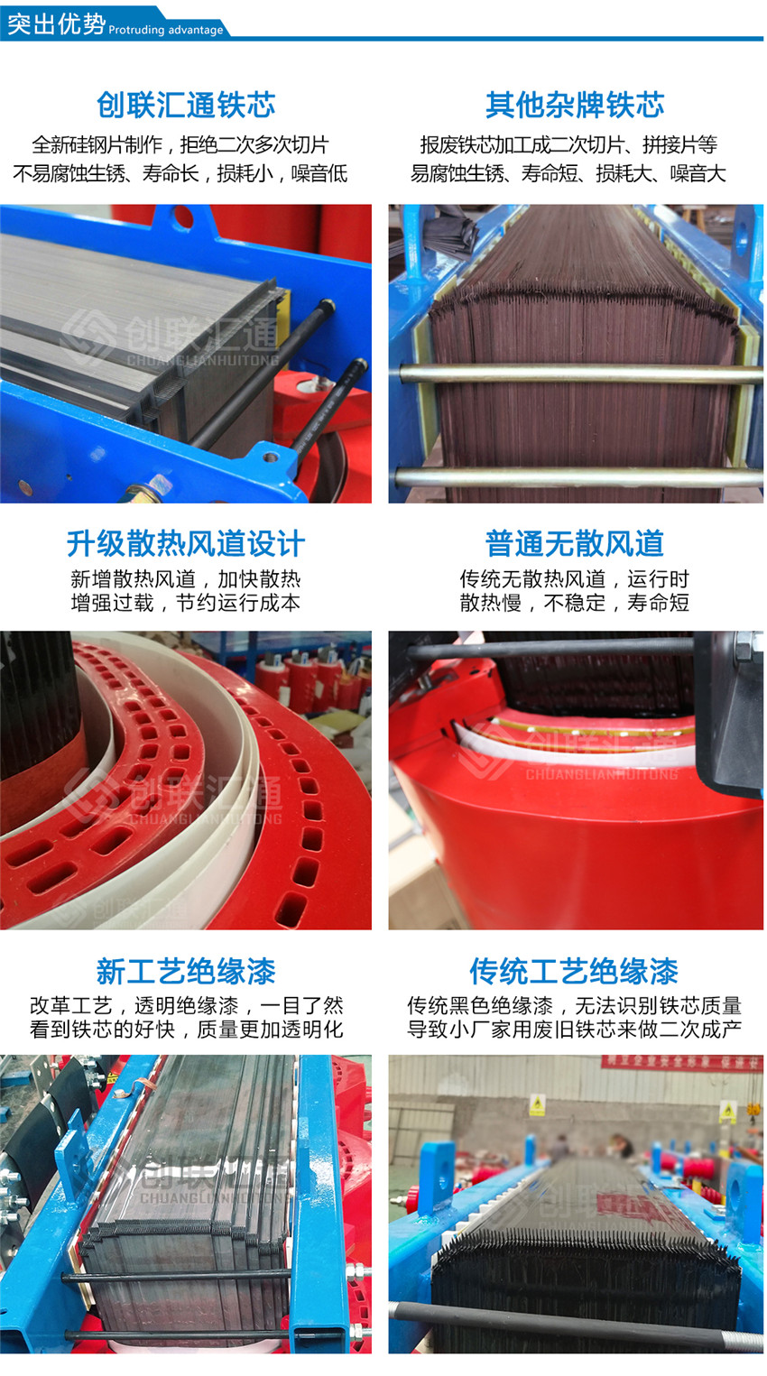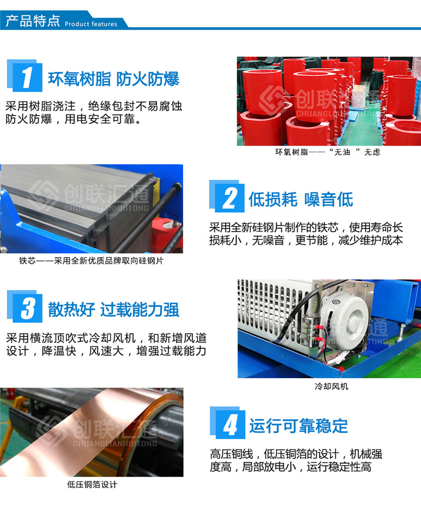 雙分裂環(huán)氧樹脂澆注干式變壓器的設(shè)計符合實際應(yīng)用并具有以下技術(shù)特性: